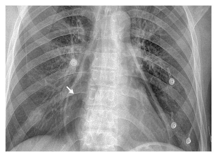 A routine complete blood count revealed 27,000 leukocytes per cubic millimeter. A chest radiograph showed pneumopericardium (arrow) without evidence of pneumothorax or pneumomediastinum.