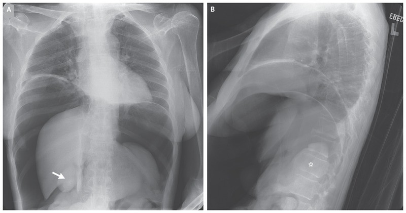 Plain-film radiographs of the chest obtained with the patient in the frontal and lateral positions revealed evidence of pneumoperitoneum, with gas extending from the infradiaphragmatic region to the inferior margin of the liver, outlining the gallbladder (Panel A, arrow). Gas outlined the spleen on the lateral view (Panel B, asterisk).