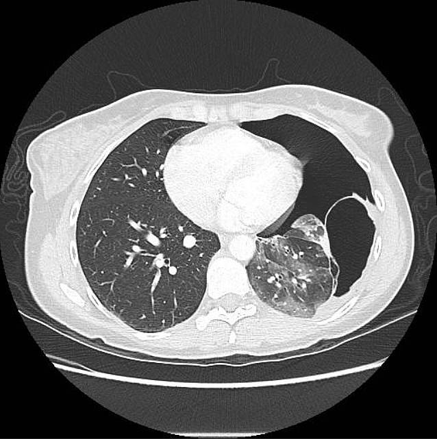 A contrast-enhanced CT of the thorax was then performed and revealed a moderately sized left-sided pneumothorax and a well-defined, thick-walled air-filled structure arising from the left lower lobe and adherent to the parietal pleura (image below).