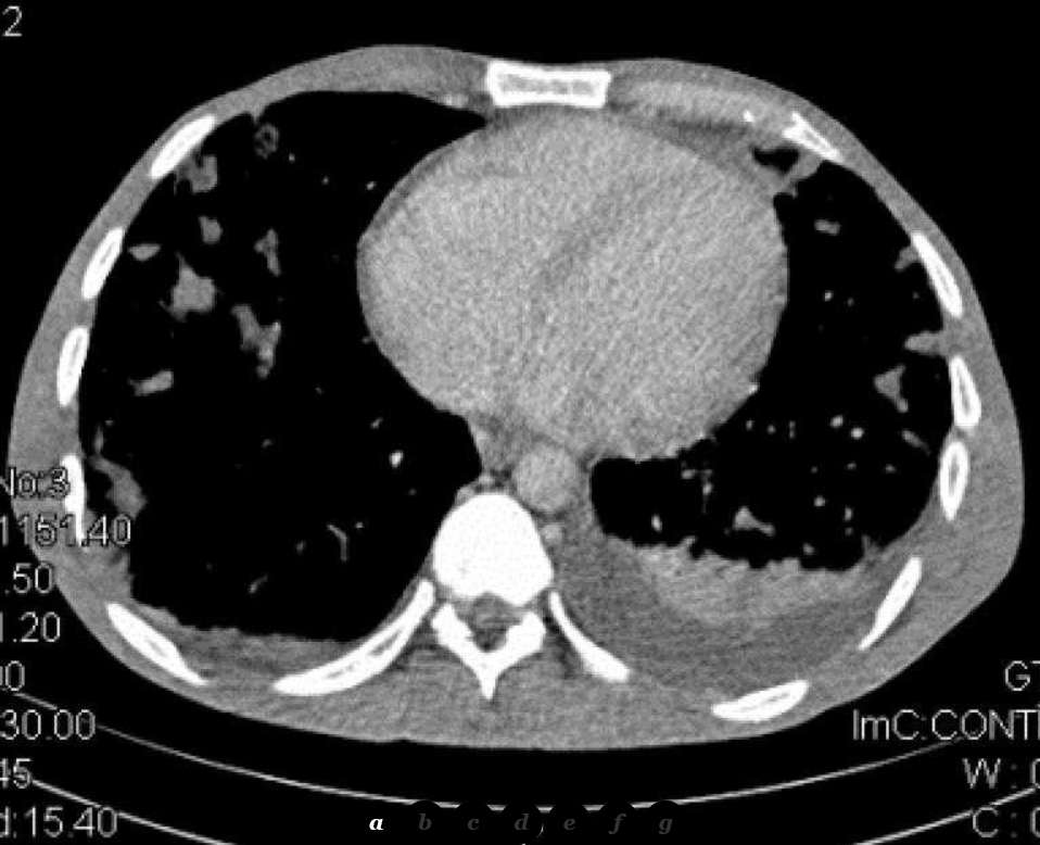The typical CT image of PSE comprises multiple round densities with or without cavitation which are located diffusely in both lungs but with a lower lobe predilection. There may also be a pericardial or pleural effusion and air bronchogram within pulmonary nodules. Septic foci are less distinctly demarcated than metastases and may have a wedge-like shape with their base on the pleura [1, 2].