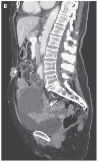 Computed tomography of the abdomen and pelvis showed a heterogeneous pelvic mass measuring 11 cm by 11 cm by 9.5 cm (arrow), moderate ascites, peritoneal carcinomatosis, and a nodule measuring 2.4 cm (largest diameter) in the umbilical region (arrowhead).