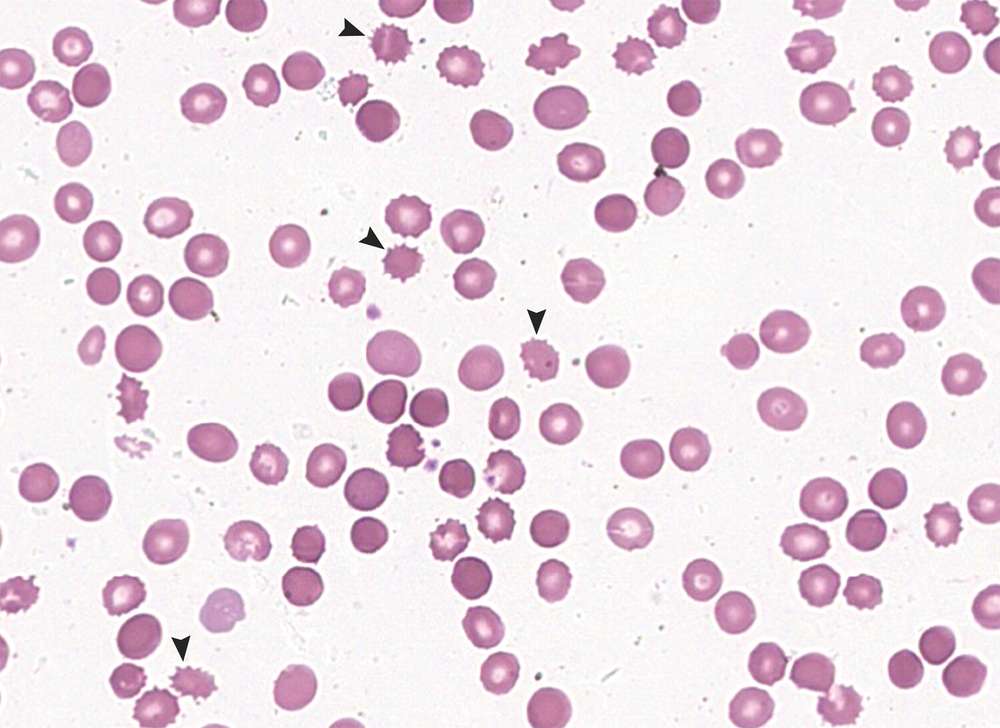 A peripheral-blood smear showed red cells lacking central pallor with irregularly distributed surface projections, features that are consistent with acanthocytes, or spur cells (arrowheads), which are seen in liver disease, in abetalipoproteinemia, and after splenectomy.