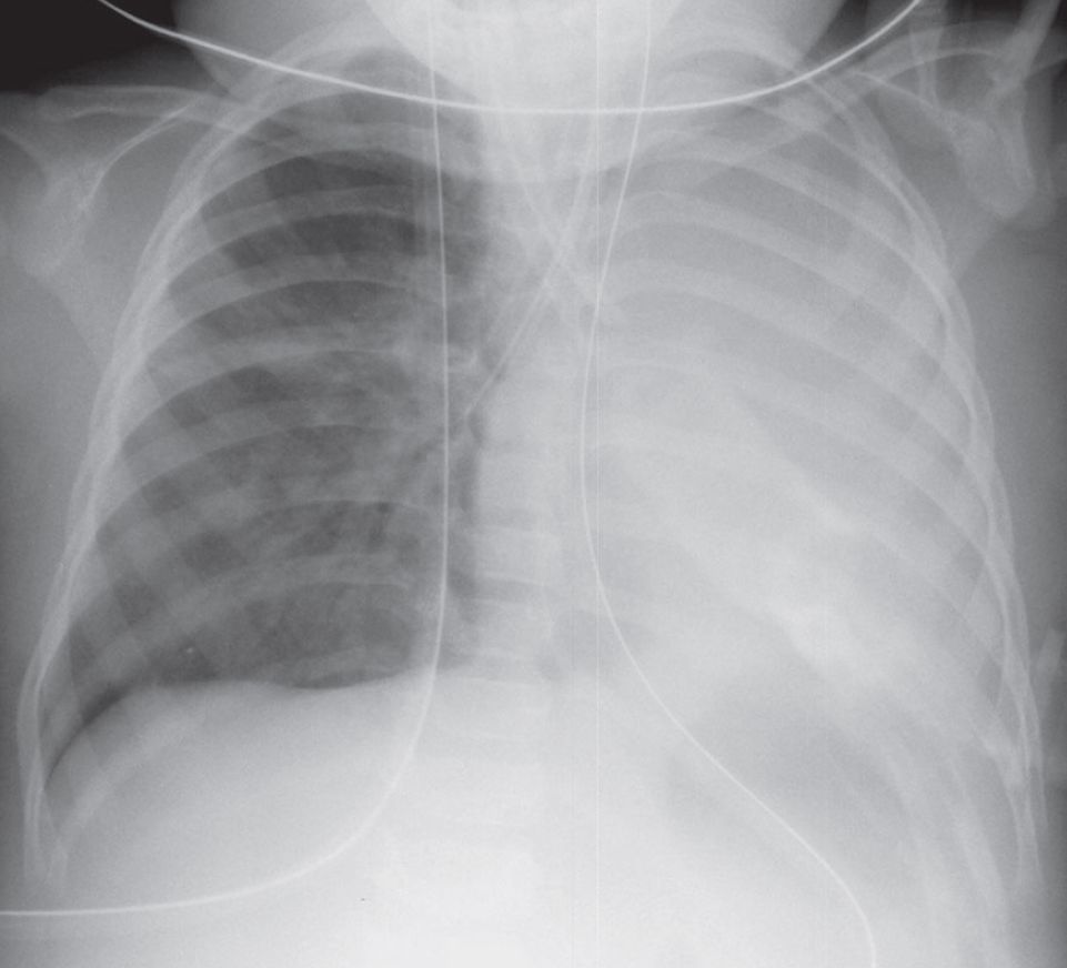 AP chest radiograph demonstrates an opaque left thorax with marked overinflation of the right lung and ipsilateral mediastinal shift. The endotracheal tube is malpositioned, with the tip in the right mainstem bronchus.