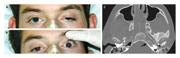 A high-resolution computed tomographic scan of his head did not show uncal herniation but, rather, revealed a complex fracture of the sella turcica (Panel C, arrow) and of the skull base (not shown), with impingement of the bony nerve canals and a C1 fracture.