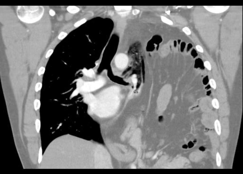 Chronic haematothorax was suspected but multi-detector computer tomography (MDCT) of the thorax confirmed a large left sided diaphragmatic defect with herniation of abdominal contents.