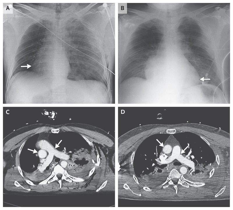 A total of 24 hours after pleural drainage, the patient’s heart moved leftward, back into its original position (Fig 1, Panel B, arrow), with complete anatomical and physiological recovery of the great vessels (Fig 1, Panel D, arrows) and other areas (Fig 2, Pictures 2, 4, and 6).