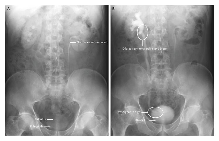 A 57-year-old man was referred to our hospital because of an acute onset of right flank pain. An intravenous urogram showed normal excretion from the left kidney, a calculus in the right pelvis, and a phlebolith in the right pelvis at 3 minutes after injection of the contrast material (Panel A).