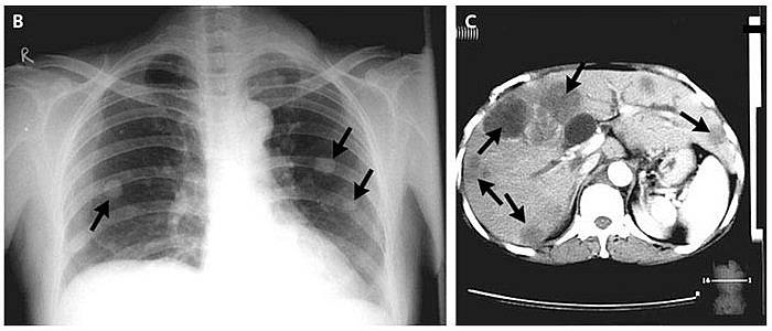 Plain radiography of the chest showed multiple nodular opacities in both lungs (Panel B, arrows). Computed tomography of the abdomen revealed multiple lesions in the liver (Panel C, arrows).