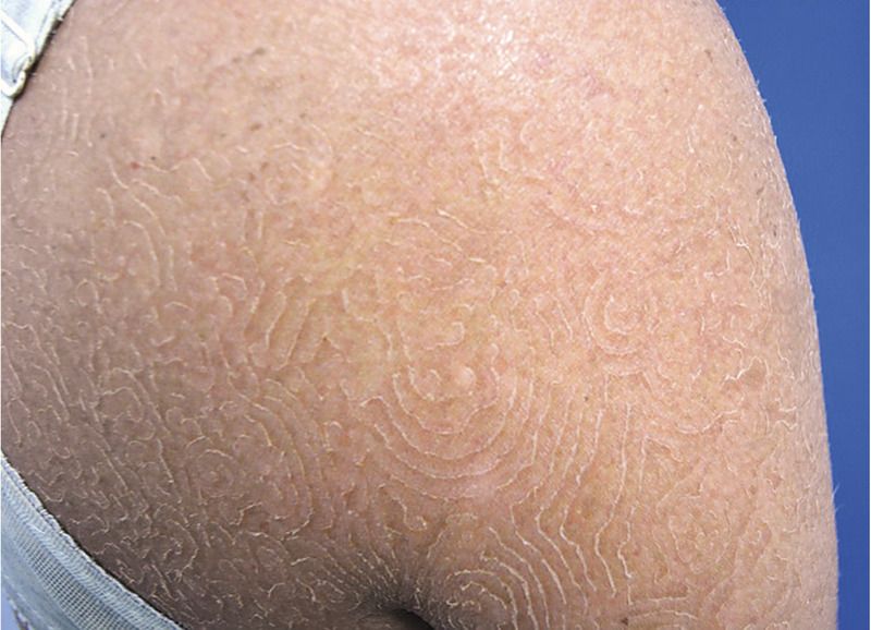 An 18-year-old Fijian woman presented with a 3-year history of a concentric, scaly rash on her shoulders; the rash was also present on her trunk, arms, and legs (not shown). The rash was pruritic and progressively spread to involve approximately 70% of the body-surface area. Her brother had similar skin findings.