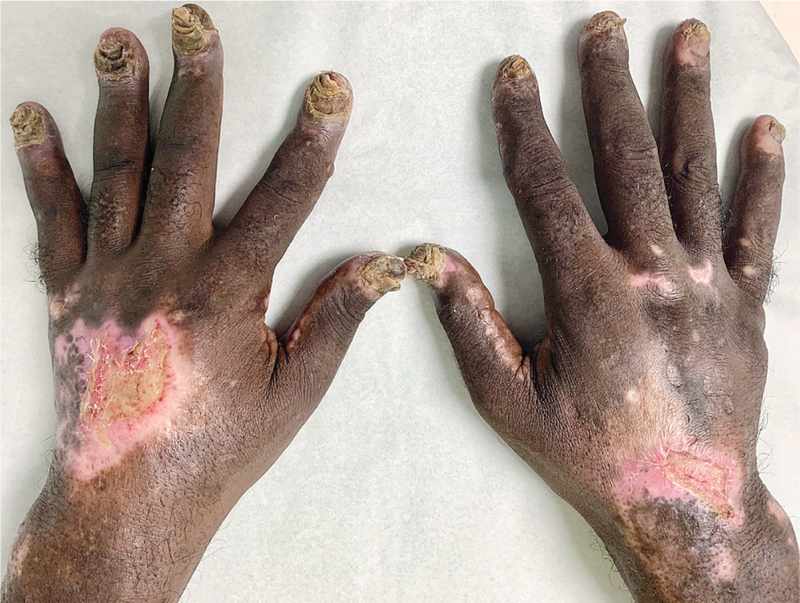 A 65-year-old man presented to the dermatology clinic with a 6-month history of worsening lesions on his hands and forearms as well as fingernail thickening. His medical history included end-stage renal disease and untreated hepatitis C virus infection.