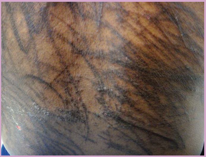 A 41-year-old man presents to the dermatology clinic for the evaluation of dark linear lesions on his back. He has a medical history of chronic kidney disease (stage II), alcohol dependency and Hodgkin’s lymphoma, for which he is currently undergoing treatment.