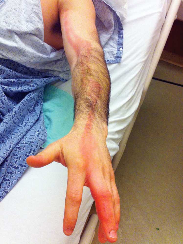 A 23-year-old man presented to the emergency department with rapidly progressive left arm pain and erythema extending from the hand to the axilla. He had felt well until the previous night, when his left third finger was injured during a lacrosse game.