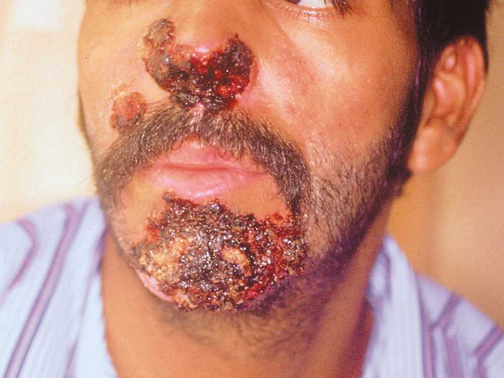 A 30-year-old man with the acquired immunodeficiency syndrome (CD4 cell count, 14 per cubic millimeter) presented with a six-month history of enlarging facial lesions.