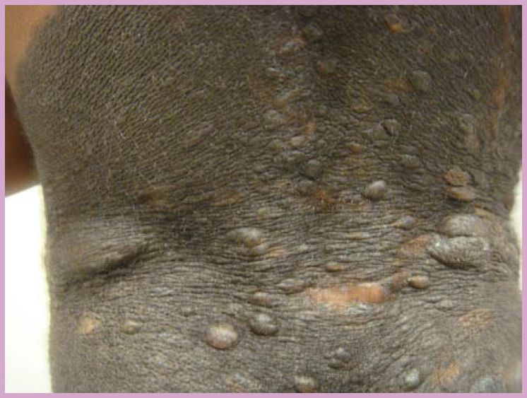 On examination, there is a large brown-blue lesion covering much of the back, with areas of thickened papules and diffuse thin hairs throughout the lesion.