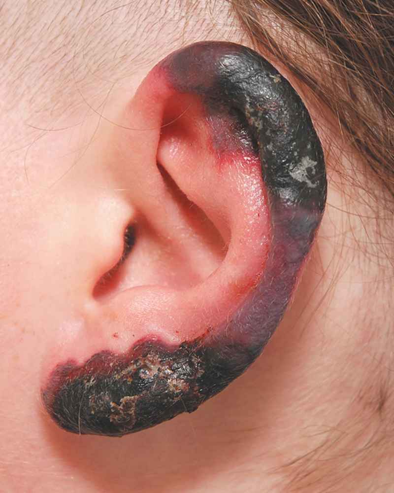A 31-year-old woman presented with multiple necrotic skin lesions on her nose, ears, and legs that had developed over a period of a few days. The lesions had begun as erythematous-bluish macules that soon became bullous and finally, after approximately 10 days, developed into thick necrotic plaques.