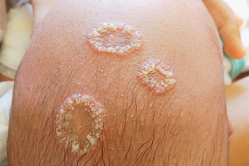 The lesions were annular with raised papular and pustular borders and flat, hyperkeratotic central areas. The baby’s mother, who was originally from Somalia, had similar skin lesions on her upper trunk.