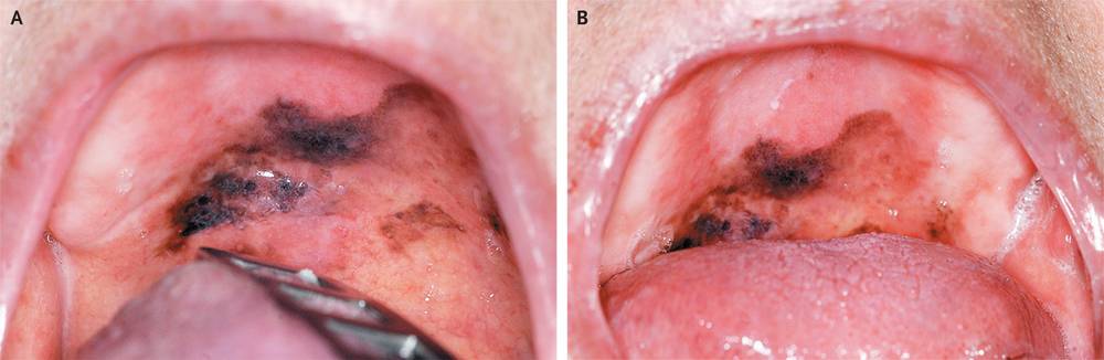 A 75-year-old white man presented with a 3-week history of nonpainful discoloration of his palate. The lesion had developed spontaneously beneath his dentures and expanded toward the mucosa of the soft palate. He reported having no history of nicotine or alcohol use.