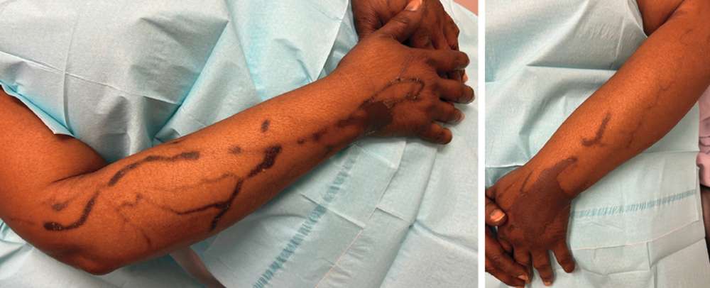 On examination, hyperpigmented plaques were observed on the dorsa of both hands at the sites of previous intravenous access. The darkened skin extended up the arms in a linear pattern along the network of superficial veins; the lesions were palpable but non-tender.