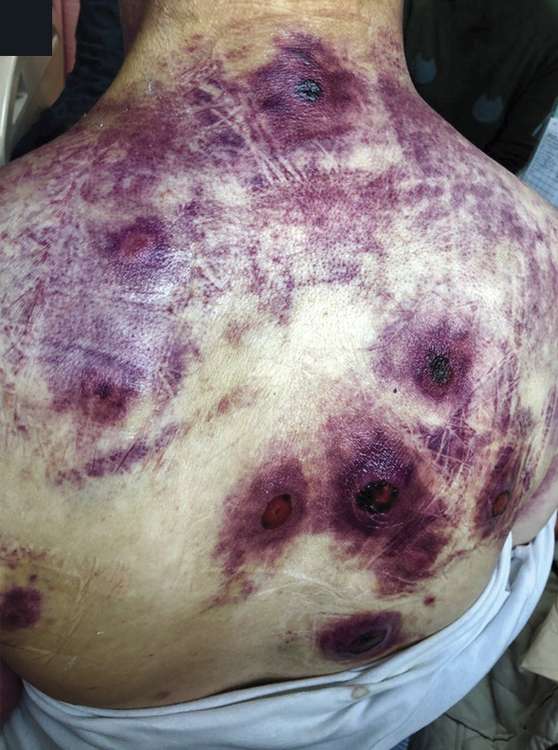 A 53-year-old man presented to the emergency department with a 1-month history of relapsing fevers, dyspnea, and rapidly progressive skin lesions. Physical examination revealed painful, indurated nodules with surrounding purple discoloration on his back, trunk, and limbs.