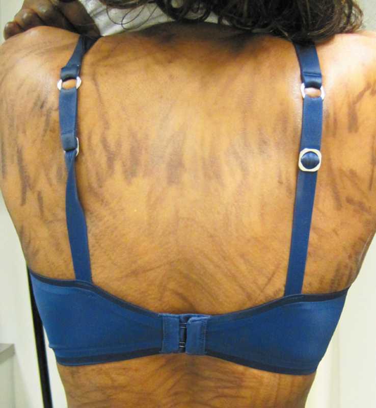 A 39-year-old woman presented with painless, nonpruritic, flagellate hyperpigmentation on her trunk, 1 week after intralesional sclerotherapy of vascular malformation of the posterior tongue.