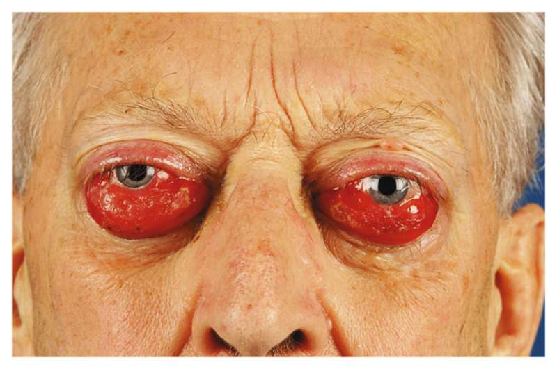 An 81-year-old man presented with a 7-month history of gradual, painless swelling and redness of both eyes. He reported blurred vision and weight loss of 10 kg (22 lb).