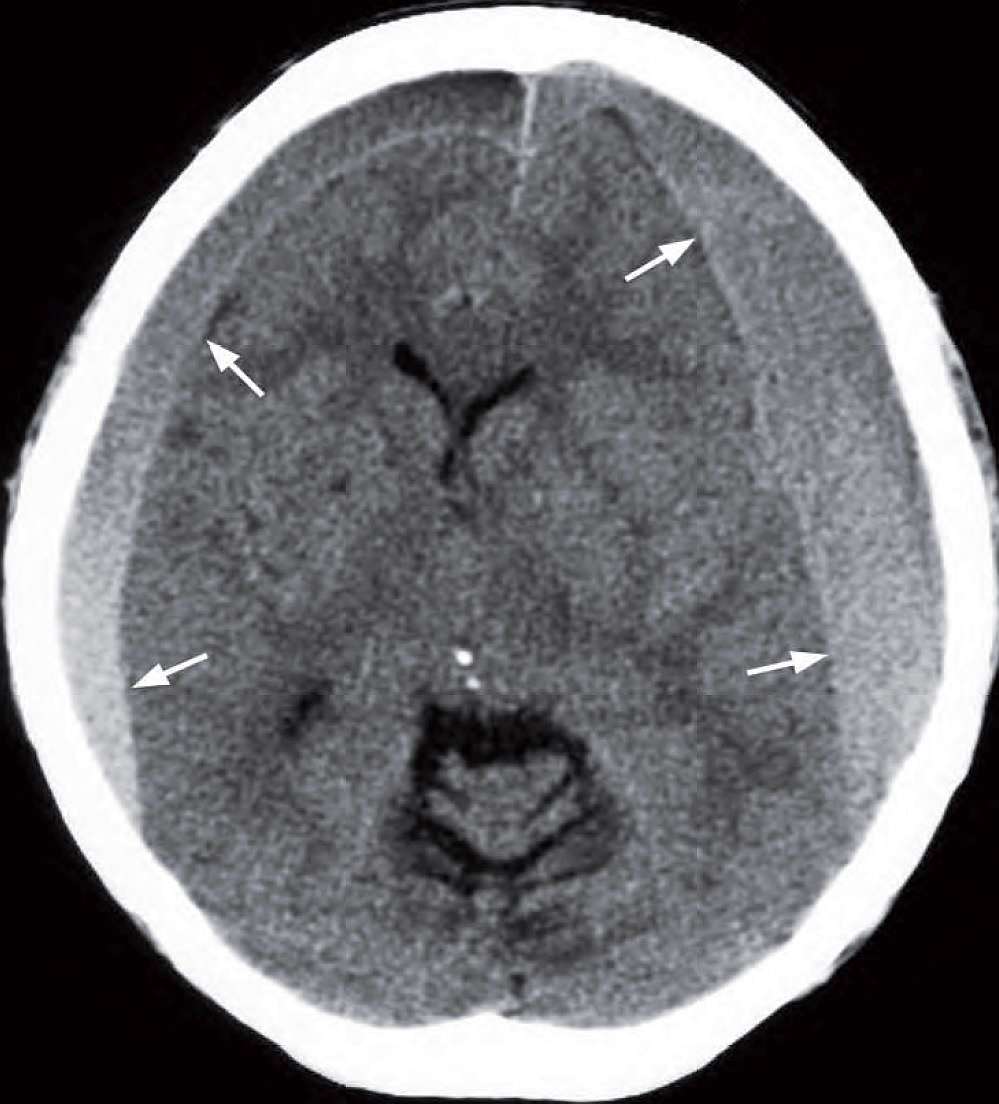 A 73-year-old woman presented with chronic headache, occasional vomiting, unsteadiness and frequent falls. In the past few months there had been a progressive deterioration in her mental function and increasing drowsiness. Physical examination showed moderate papilloedema but was otherwise unremarkable. A CT brain was performed.