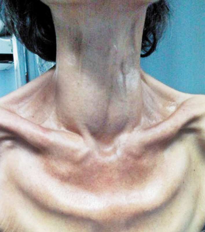She also had lid retraction, mild proptosis, and conjunctival injection. The patient had been aware of a mass growing in the anterior neck for the previous 6 years and had more recently noted hair loss, heat intolerance, and a resting tremor.