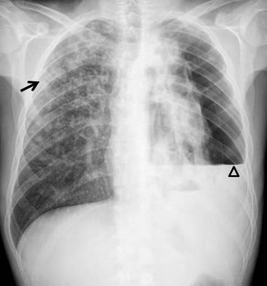 A 28-year-old male Spanish patient presented with weight loss and anorexia for one year, in association with dyspnoea, fever, cough, expectoration and left pleuritic pain during the past week. On physical examination during chest auscultation hypophonesis was noted on the left side.