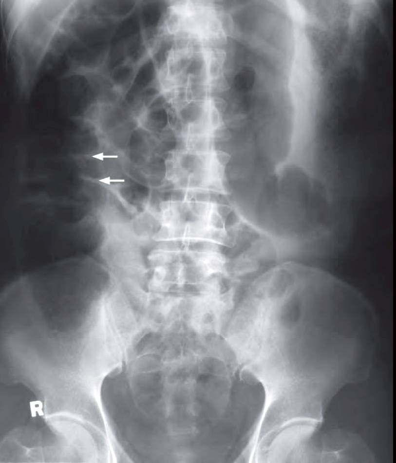 An 80-year-old man presented with colicky abdominal pain, constipation for three days, and repeated vomiting for 1 day. Physical examination showed a distended abdomen with hyperactive bowel sounds. No abdominal mass or organomegaly was detected. Laboratory investigations were unremarkable.
