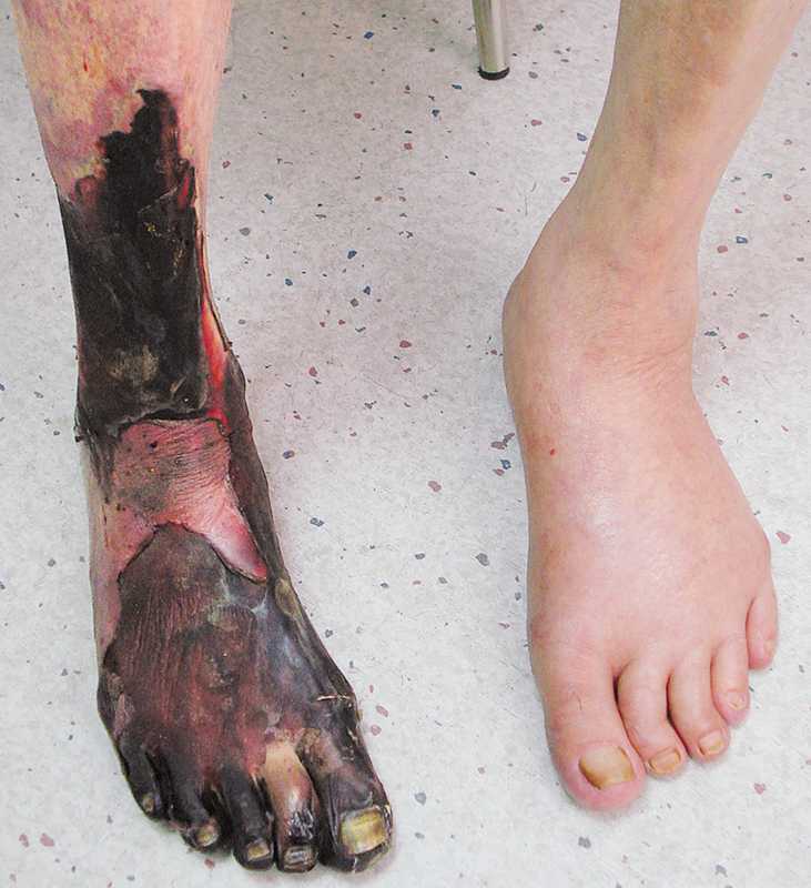 An 88-year-old man who reported he did not smoke and who had a long-standing history of diabetes mellitus, hypertension, and hypercholesterolemia was admitted to the hospital with a 4-month history of pain in the right lower leg.
