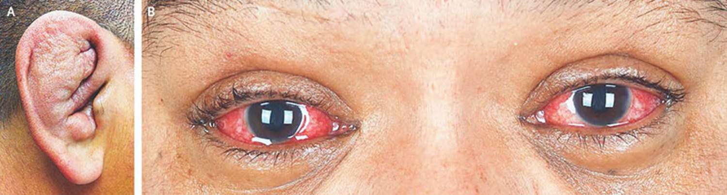 A 46-year-old man presented with a 1-month history of bilateral auricular pain and swelling of the pinnae, followed by bilateral eye redness, pain, and photophobia. Review of systems was notable for pain in the right wrist.