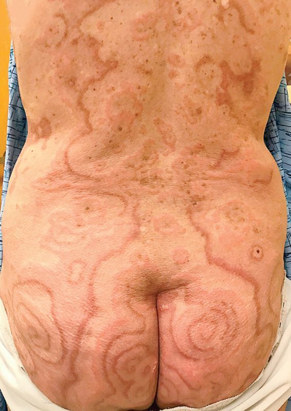 A 73-year-old woman presented to the dermatology clinic with an 11-month history of an evolving pruritic, erythematous rash on her thighs and buttocks. On physical examination she was noted to have polycyclic erythematous plaques.