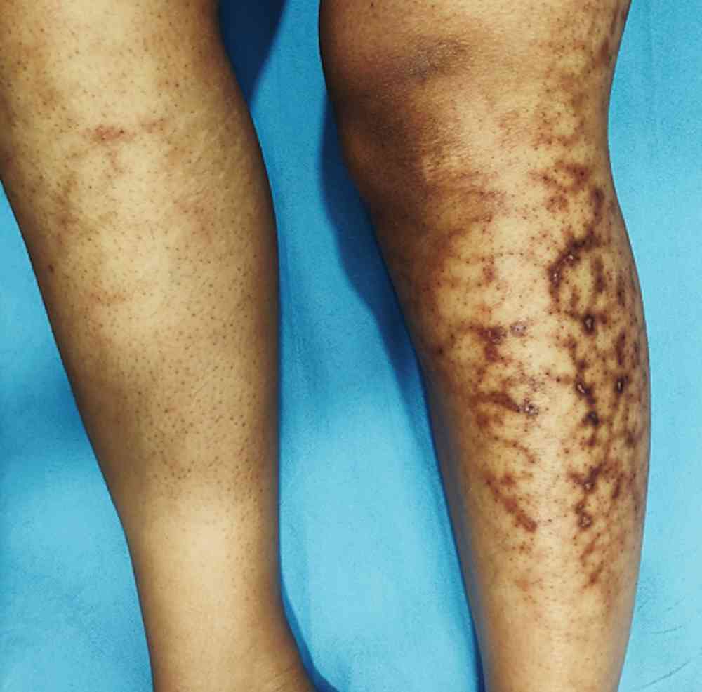 A 24-year-old woman presented with a 2-month history of rash on her shins. The rash was asymptomatic and was more prominent in the left leg. It had first appeared during the winter.