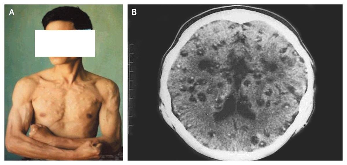 A 42-year-old man presented with seizures and approximately 300 palpable intramuscular cysts, with 54 cysts on his head, face, and neck, 110 on his chest and back, 86 on his arms, and 52 on his legs (Panel A).