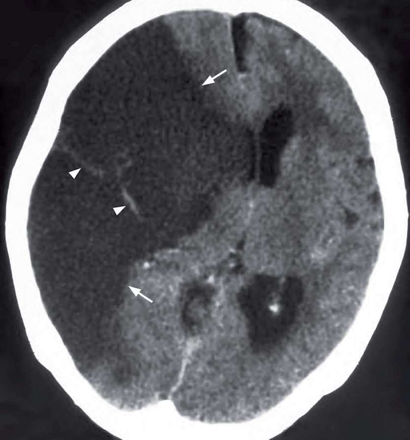 72-year-old woman with a history of poorly controlled hyperlipidaemia, hypertension and diabetes mellitus suddenly lost consciousness and developed left-sided weakness. Physical examination showed a BP of 210/120 mmHg. An urgent CT brain was performed.