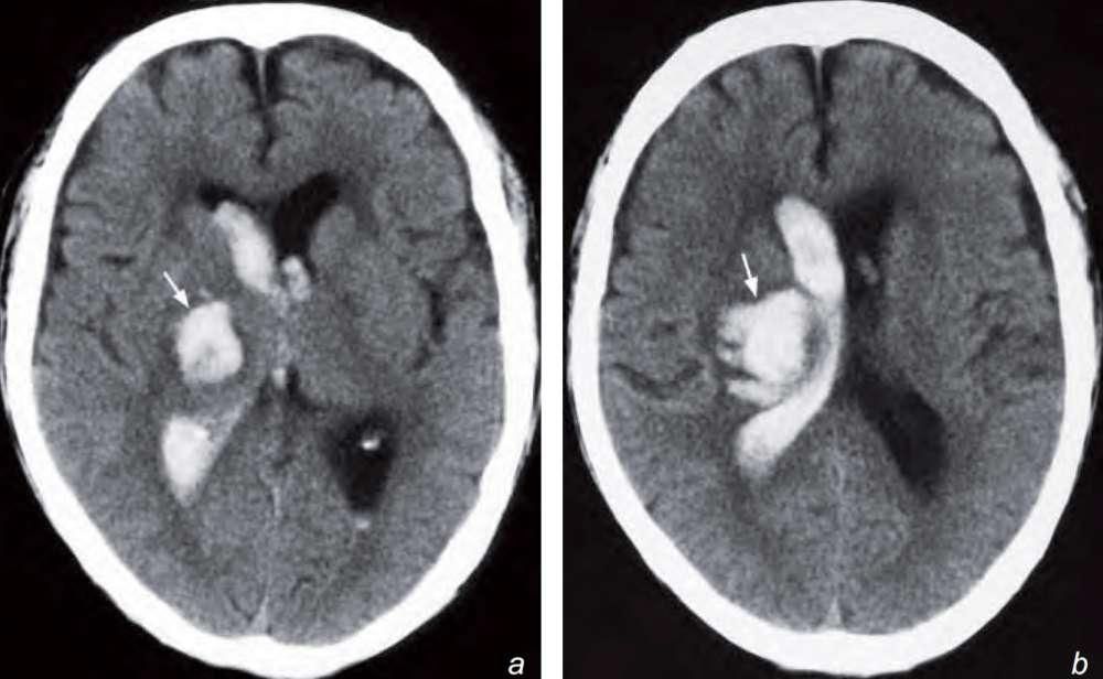 A 75-year-old man with diabetes and uncontrolled hypertension was admitted to the medical ward after suddenly becoming unconscious and developing a hemiparesis. On admission he was hypertensive with a dense left hemiplegia. An urgent CT brain was performed.