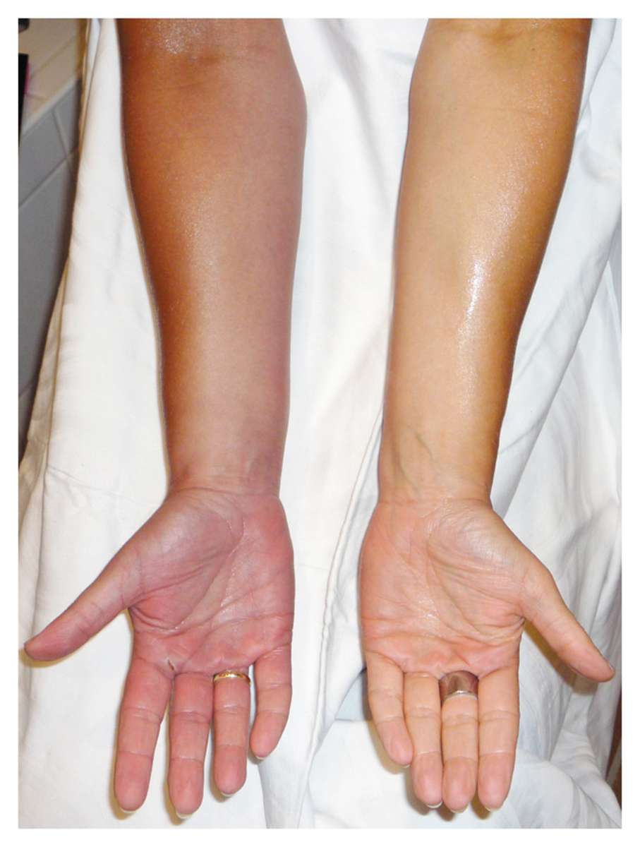 Swelling and Red Discoloration of the Right Arm and Hand Post category:Spot Diagnosis Post published:August 26, 2021 Share on Facebook Share on X (Twitter) Share on Pinterest Share on Email Share on Reddit A 47-year-old woman with no medical history presented with swelling, pain, and reddish discoloration of the right arm and hand after strenuous effort. What is the diagnosis? FULL CASE AND ANSWER Share on Facebook Share on X (Twitter) Share on Pinterest Share on Email Share on Reddit Read more articles Previous PostAnnular, Scaly, Blistering, Violaceous Plaque after use of Antibiotic Next PostPatient with Shortness of Breath and Cirrhosis You Might Also Like Migratory, Pruritic Skin Eruption March 8, 2022 67-year-old Woman with a 6-month History of Dyspnea and Dysphagia December 2, 2021 A Diagonal Crease in Each Earlobe September 7, 2021