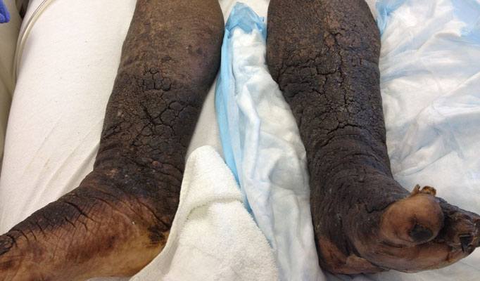 She had been prescribed compression stockings many years earlier, but failed to use them. Her medical records indicate that she was admitted to the hospital on multiple occasions for lower extremity cellulitis.