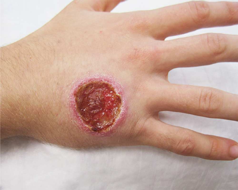 A 19-year-old man presented to the dermatology clinic with a 3-month history of an enlarging ulcer on his right hand and multiple tender subcutaneous nodules on the right forearm and elbow. Five months earlier, he had traveled to Ecuador, and worked on an organic produce farm. On physical examination, the ulcer measured 3 cm in diameter and was tender with a firm border.