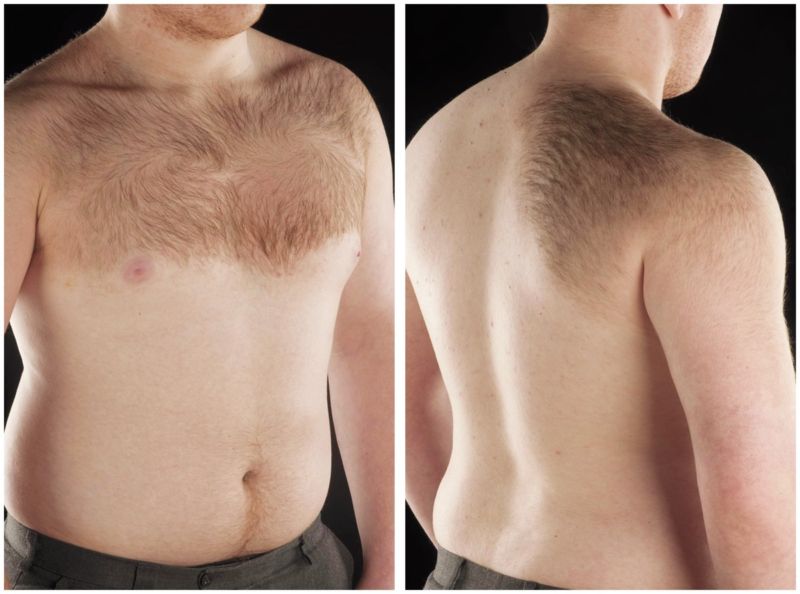 A healthy 15-year-old boy presented to the dermatology clinic with a well-demarcated tan-colored patch covered with coarse dark hairs, spanning his upper chest and extending onto the right shoulder and back.