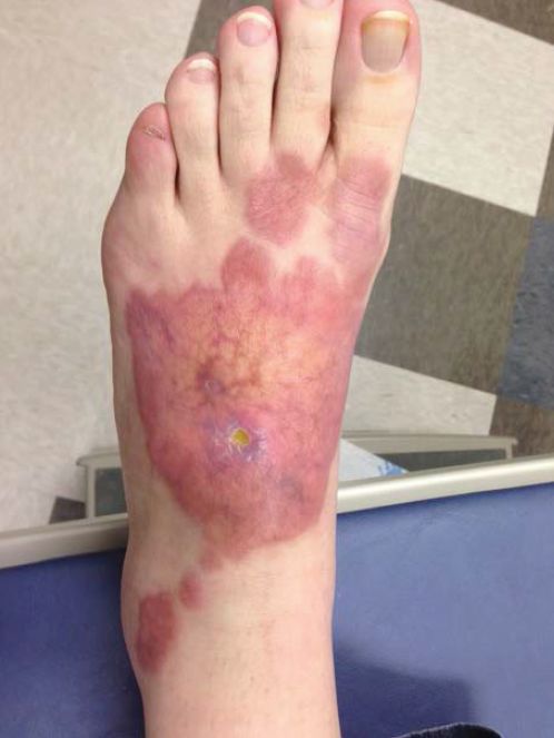 A 64-year-old Caucasian woman with a history of hypertension, rheumatoid arthritis and poorly controlled type II diabetes mellitus presents for evaluation of colour changes on her left foot.