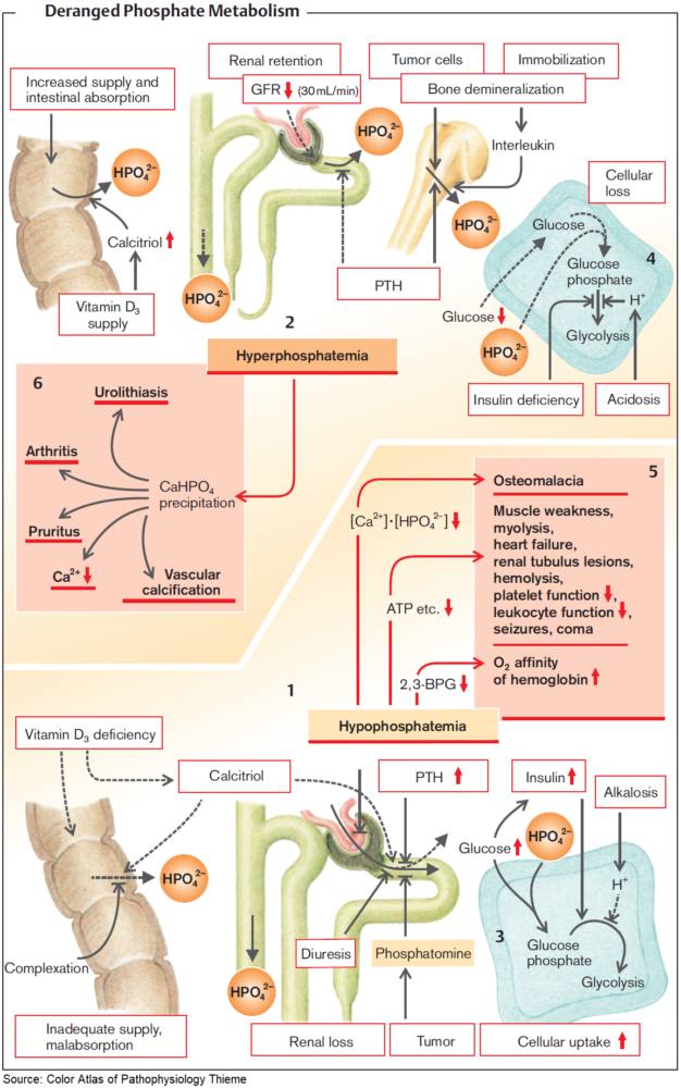 The many causes of hypophosphatemia include decreased phosphate intake or increased absorptive states, hyperventilatory states, hormonal and endocrine effects, medications, and disease states.