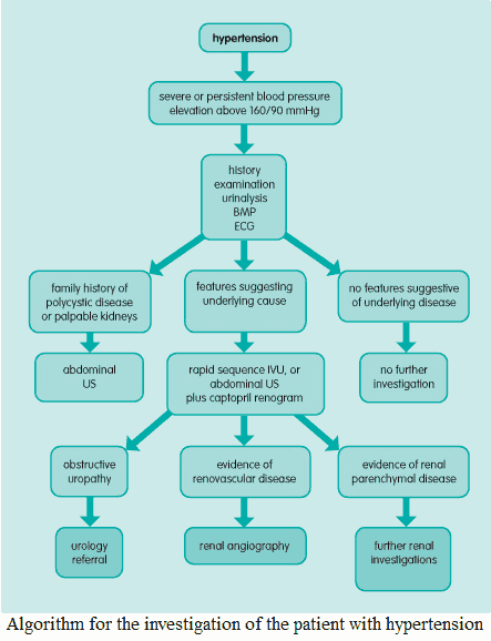 - Radiologic investigations: renovascular disease, renoparenchymal disease, obstructive uropathy. This should be either rapid sequence intravenous urogram, or abdominal ultrasound scan plus captopril renogram.
