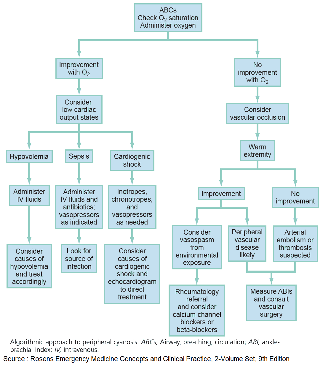 Peripheral local cyanosis is caused by local pathologies of the arterial or venous vessels. The extremity is marbled (and not cyanotic) in the presence of total occlusion of a peripheral artery.