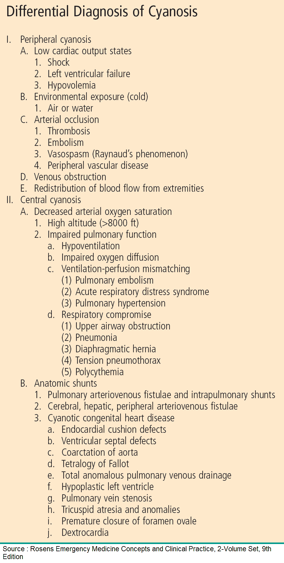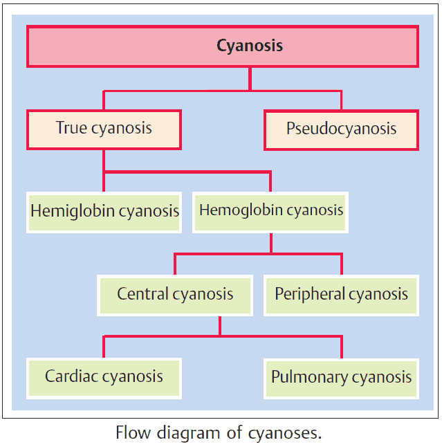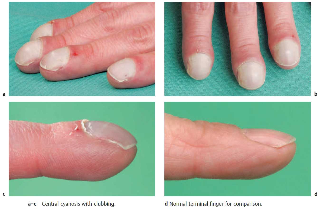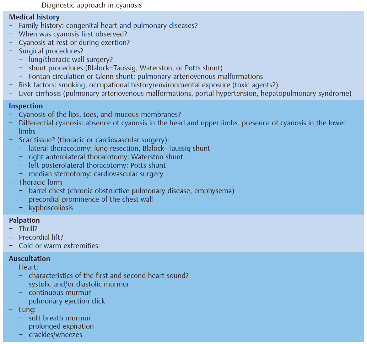 The medical history and the meticulous systemic clinical examination are critical in order to evaluate and to differentiate the wide spectrum of cyanosis. Inspection of the fingers, toes, and mucous membranes provides clues for differentiation of central, as opposed to peripheral, cyanosis. An accurate medical history (interview) is a clinical skill that is essential for the differential diagnosis!