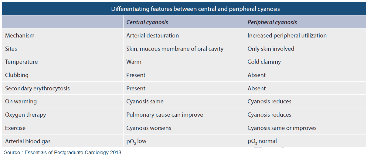 The Lewis method is useful in the clinical differentiation between central and peripheral cyanosis: central cyanosis is present when the ear lobe remains cyanotic after massage until the appearance of the capillary pulse. There may be combined clinical feature of both central and peripheral cyanosis. The presence of clubbing and/or warm hands is consistent with central cyanosis (see Fig. 1).