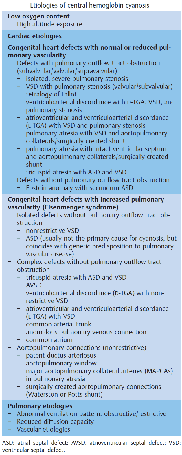 Central cyanosis is most frequently caused by cardiac and pulmonary diseases, either congenital or acquired. Low oxygen content in the ambient air may occasionally cause central cyanosis. The medical history and clinical examination are crucial in order to differentiate between cardiac and pulmonary disease. Combined forms (cardiac and pulmonary disease) may also occur.
