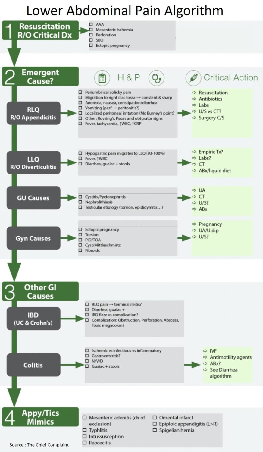 - The differential for lower abdominal pain may come down to GI (appendicitis, diverticulitis) vs pelvic etiology (in females) and will need further imaging based on suspicion (CT A/P vs pelvic ultrasound)