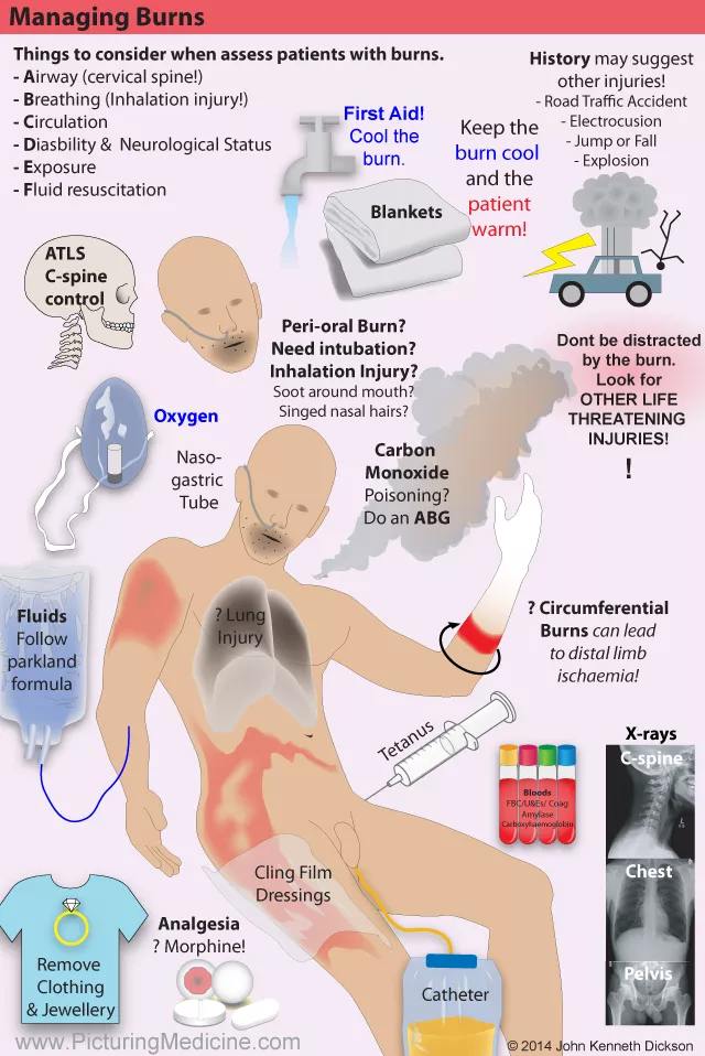 - Asses for other injuries, asses burn severity (below), consider transfer