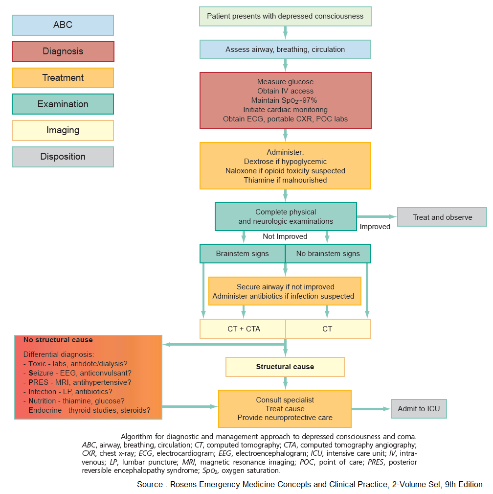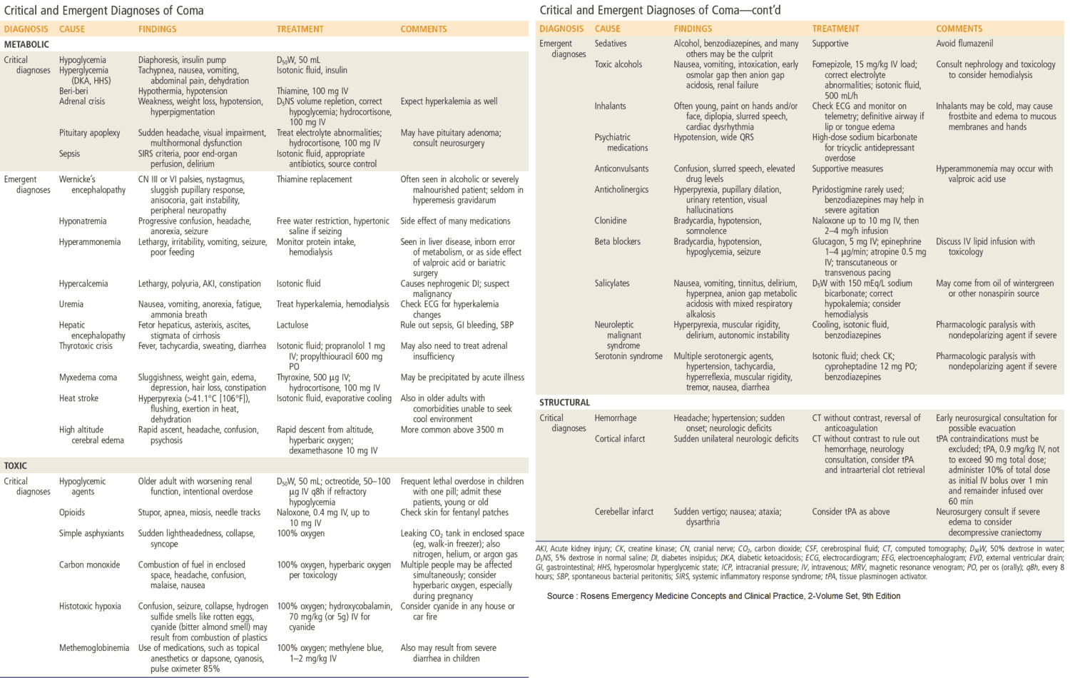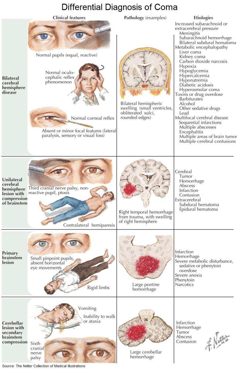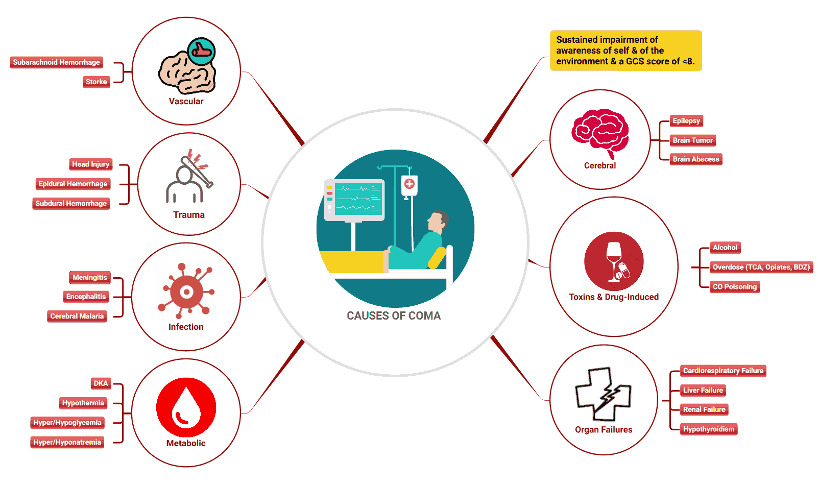In coma, the patient remains unconscious and is unarousable. Coma can be caused by the following: